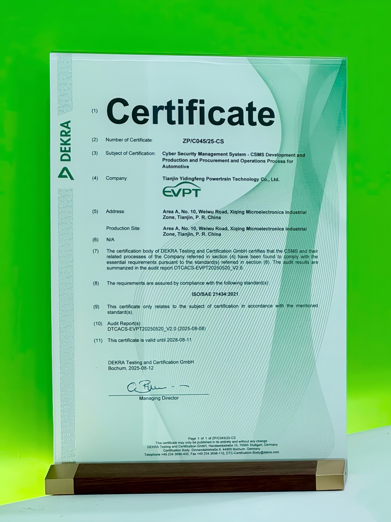 On August 12, 2025, Tianjin Yidingfeng Powertrain Technology Co., Ltd. (hereinafter referred to as "EVPT") successfully passed the audit by DEKRA and was awarded the ISO/SAE 21434 Automotive Cyber Security Certification. This significant milestone marks that EVPT has elevated its capabilities in the R&D of automotive electronic control units and the establishment of safety management systems to a new level.